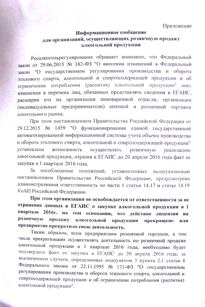 информационное сообщение для организаций, осуществляющих розничную продажу алкогольной продукции